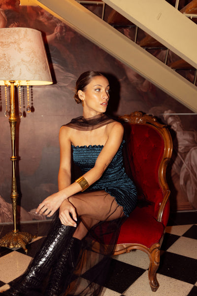 Vestido strapless elástico con pieza de tul. Tiene cuello desmontable de tul.
